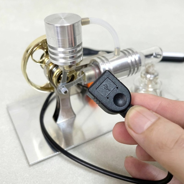 Silnik Stirlinga w tym zestawie umożliwia podłączenie urządzeń USB, takich jak lampka LED lub telefon. W komplecie znajduje się lampka USB, dzięki której można od razu zobaczyć efekt wytwarzania energii. To praktyczny sposób, aby zrozumieć, jak ciepło zamienia się w prąd, który następnie zasila urządzenia codziennego użytku.